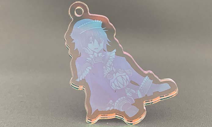 アクリル板の裏面に光を反射するオーロラフィルムを貼り付けることにより、オーロラ加工を施しております。 製法の特性上、オーロラフィルムに細かな傷や気泡が入る場合がありますが、仕様とさせていただきます。 オーロラアクリルキーホルダーの商品ページはこちら