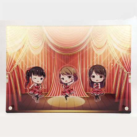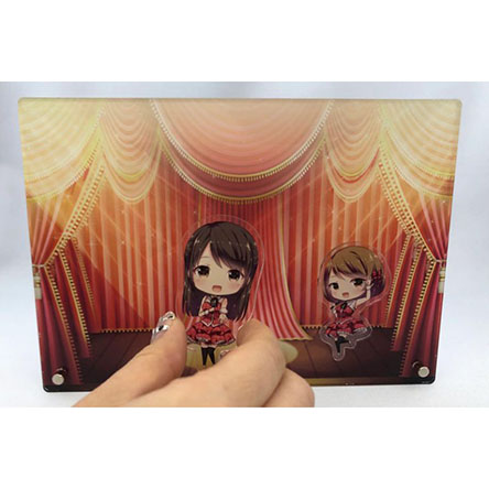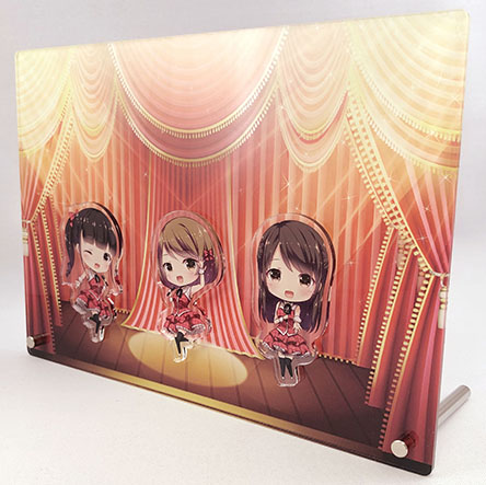 キャラステージ(アクリルボード)は最小ロット30個。単価1,004円から作成可能です。サイズは背景パネルが18×12cm~31×24cm。キャラパーツは4cm~6cm以内です。