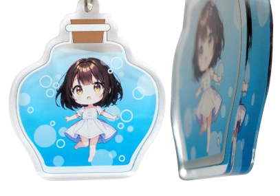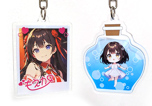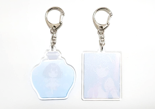 レイヤーアクリルキーホルダー(レイヤーアクキー)はアクリルの表面と裏面の両面に印刷を施すことで、通常の片面印刷アクキーよりも立体感・奥行きのある表現ができます。