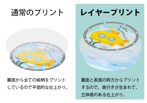 レイヤーアクリルキーホルダー(レイヤーアクキー)はアクリルの表面と裏面の両面に印刷を施すことで、通常の片面印刷アクキーよりも立体感・奥行きのある表現が可能です。